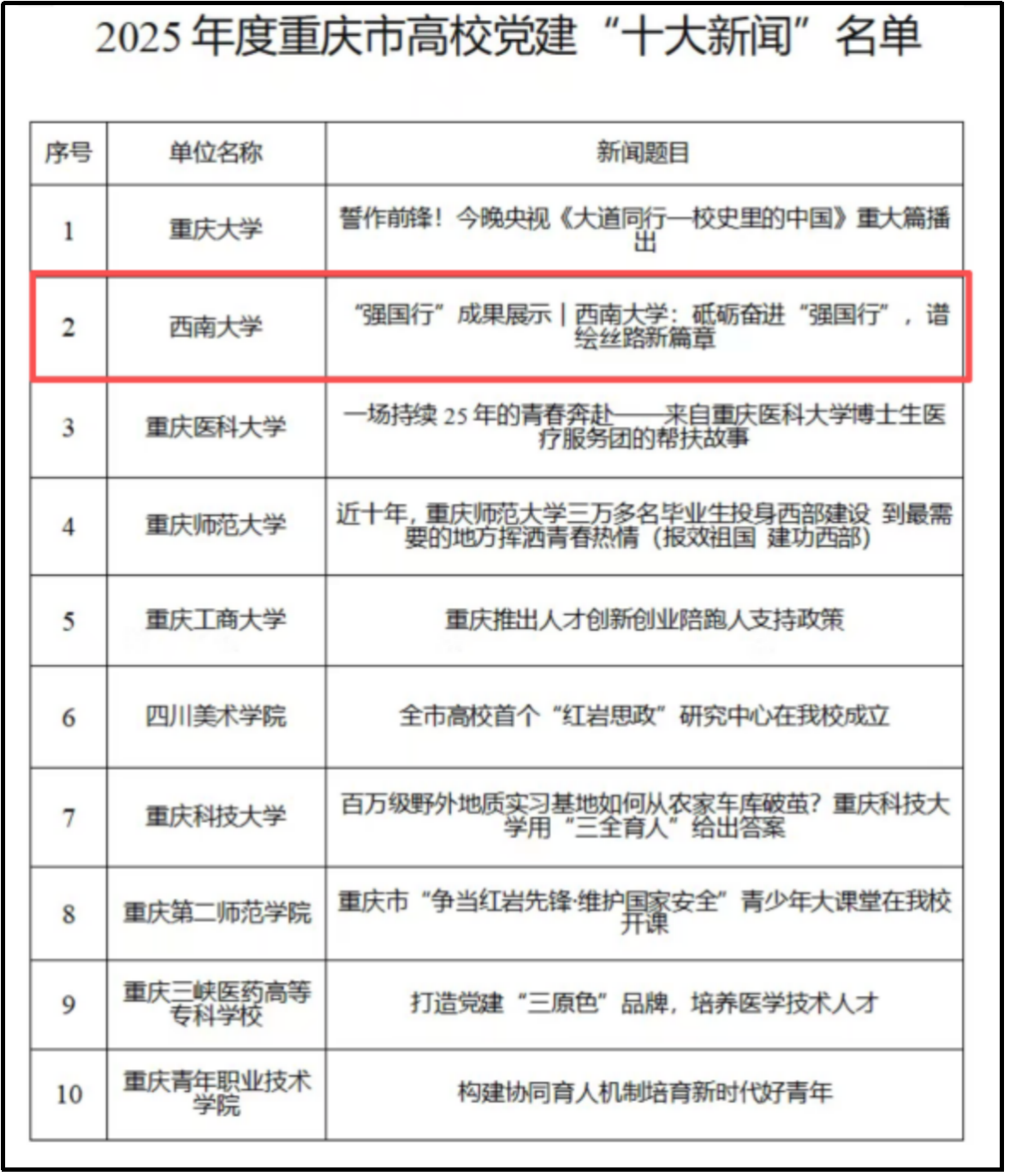 学院党建新闻入选2025年度重庆市高校党建“十大新闻”