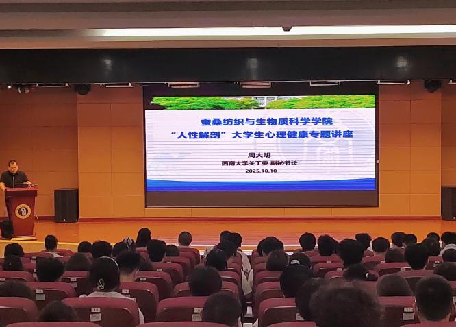 发布时间: 2025-10-16 09:39:06 已阅读:为助力我院学生培养积极心理状态,开启绚烂多彩的大学生活,2025年10月10日下午,学院在隆平楼404报告厅开展了“人性解剖”大学生心理健康专题讲座。本次讲座特邀西南大学关工委副秘书长、西大红五老服务团副团长周大明担任主讲嘉宾,学校离退休党委副书记、纪委书记熊伟,学院团委书记鲁萍,新生辅导员冯洁、黄宏佑以及学院2025级全体研究生、本科生聆听了本次讲座。讲座由学院党委副书记朱高峰主持。