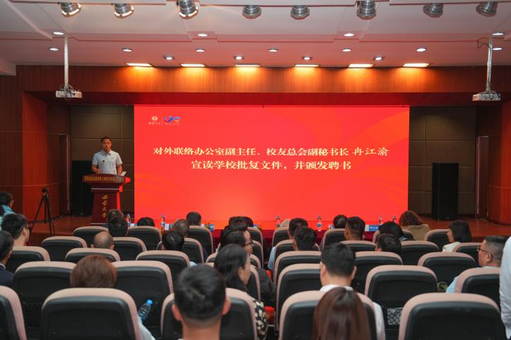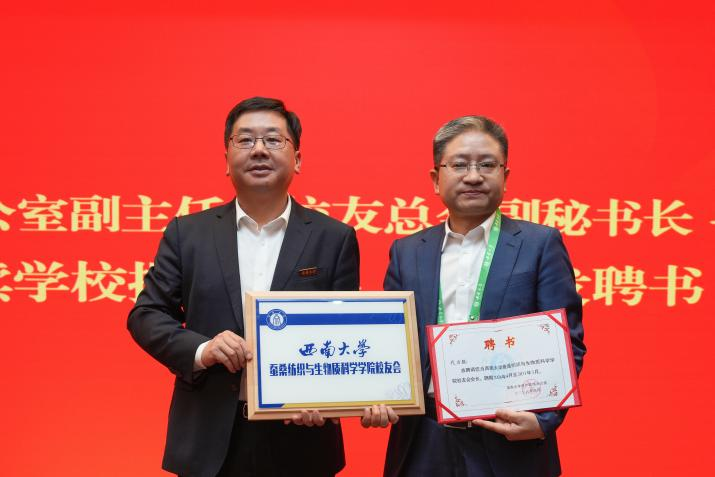 对外联络办公室副主任、校友总会副秘书长冉江渝宣读了学校校友总会关于成立蚕桑纺织与生物质科学学院校友会的批复文件。邹芙都颁发校友会相关聘书。