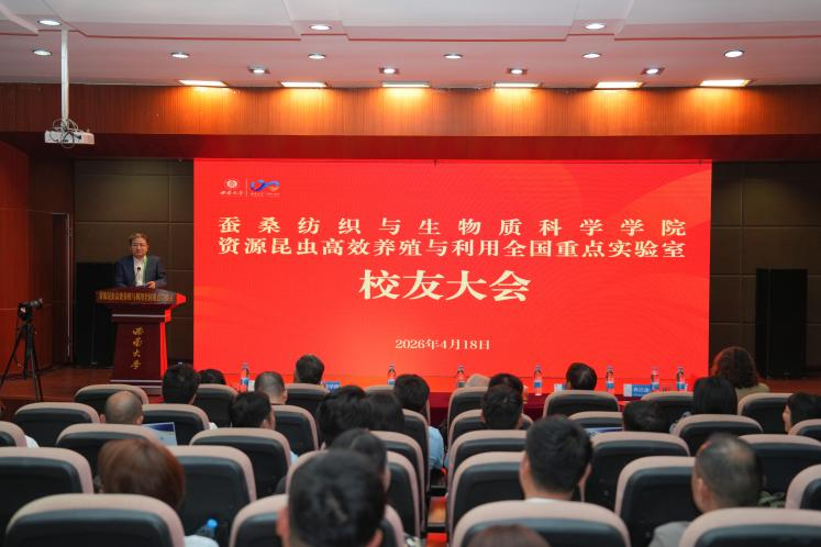 发布时间: 2026-04-20 14:43:57 已阅读:百廿征程,弦歌不辍;薪火相传,再启新章。在学校喜迎120周年华诞之际,4月18日下午,蚕桑纺织与生物质科学学院 资源昆虫高效养殖与利用全国重点实验室校友大会在蚕学宫报告厅隆重举行。来自全国各地的校友代表欢聚一堂,共叙同窗情谊,共谋学院发展。
